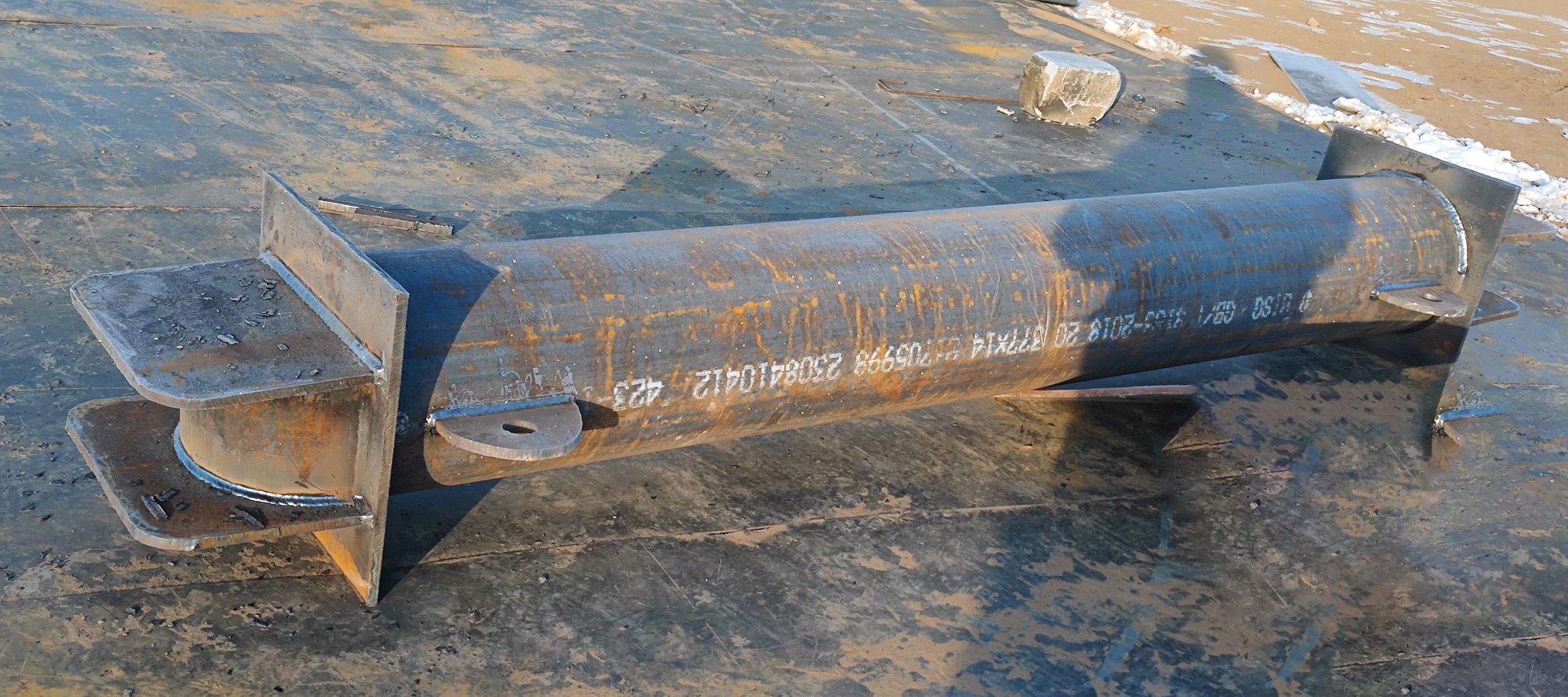 现场制作的吊装扁担,长度3080mm,采用φ377*14mm无缝钢管制作,这种撑扁担,省去了板式吊耳和卡环,安全性更高了。扁担两端的半管,对钢丝绳起到了很好的保护作用,钢丝绳不会在这个地方打弯,这是撑扁担的标准制作方法。