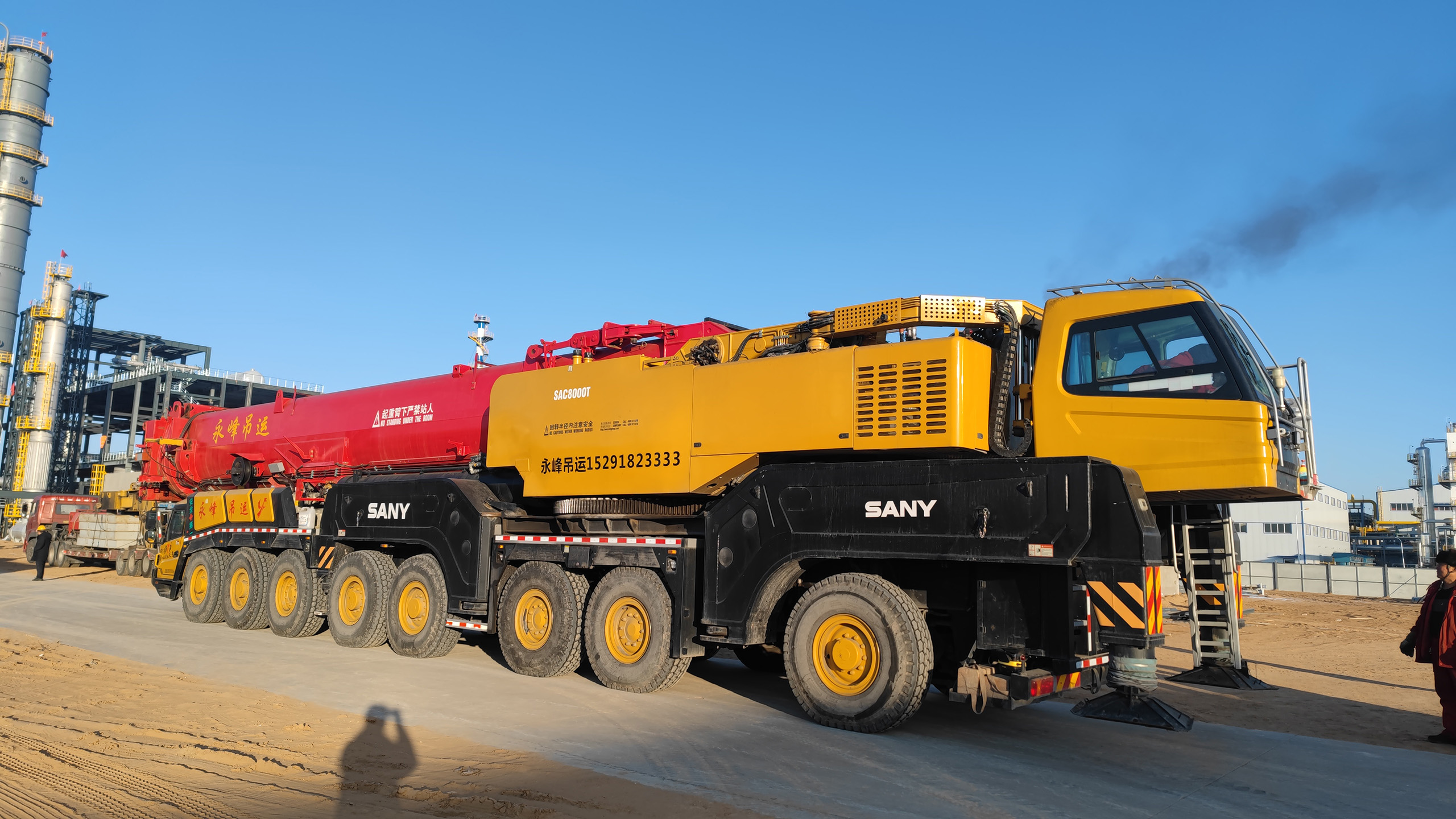 完成任务的800吨吊车。时间是下午的三点。