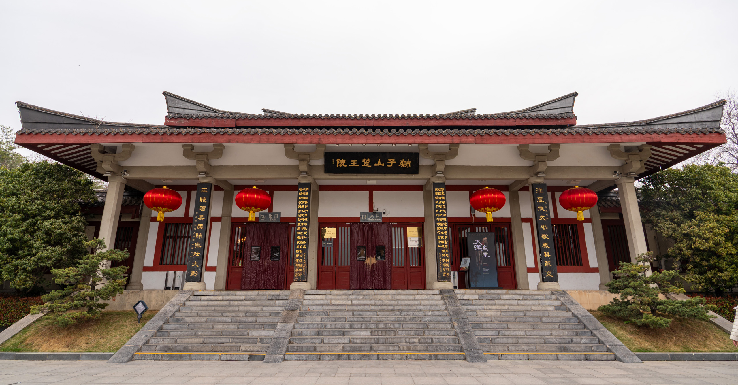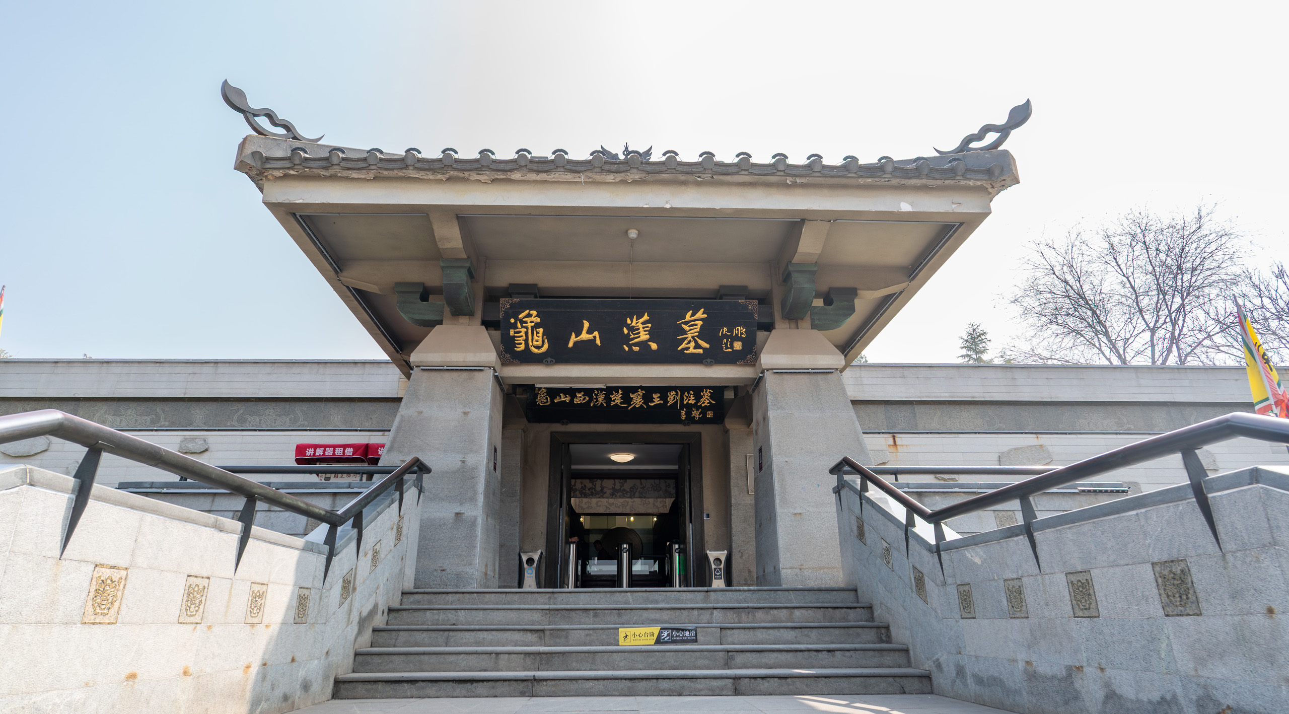 龟山汉墓鸟瞰图。墓葬南北甬道各长56米,开凿中线偏差仅5毫米,由26块重达6-7吨塞石封堵,15间墓室总面积700余平方米,构成完整的地下宫殿体系,南北墓区以壸门分隔。1981年因采石发现后,考古发掘出土刘注龟钮铜印等文物,南甬道塞石刻有44字薄葬遗训。博物馆设有文物展橱19个,陈列金器、玉器等出土文物,配套游客服务中心及无障碍设施。