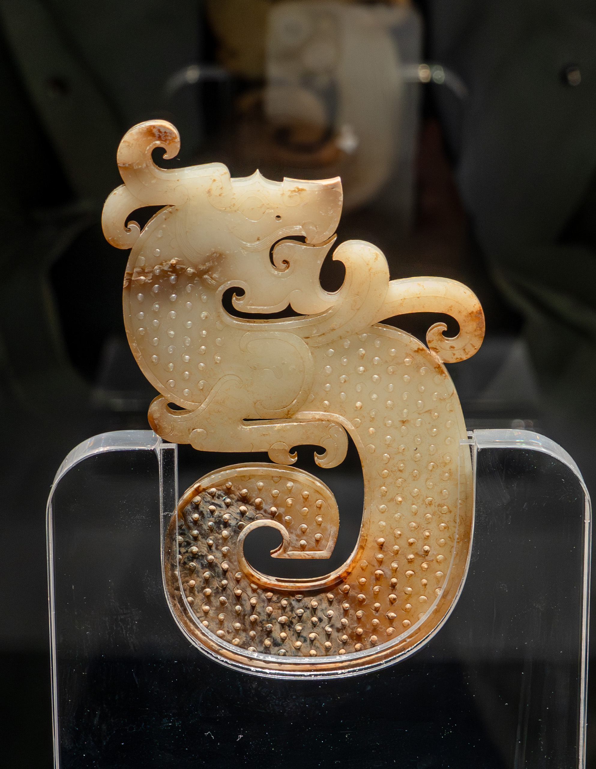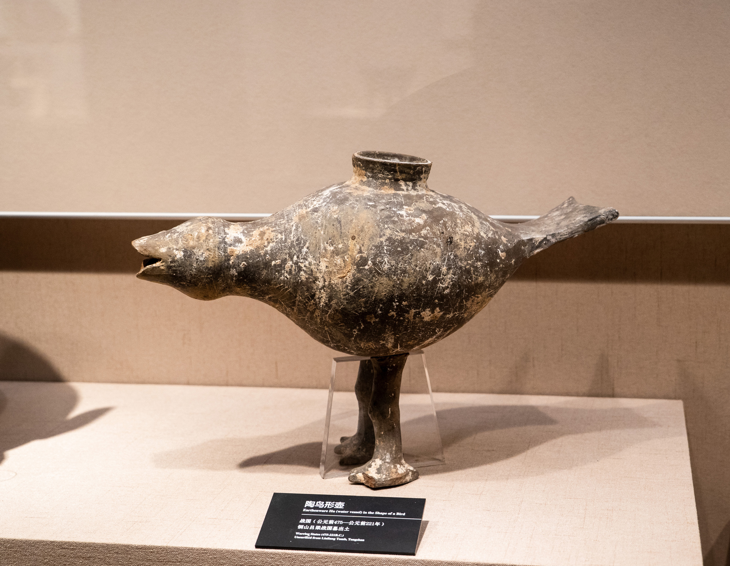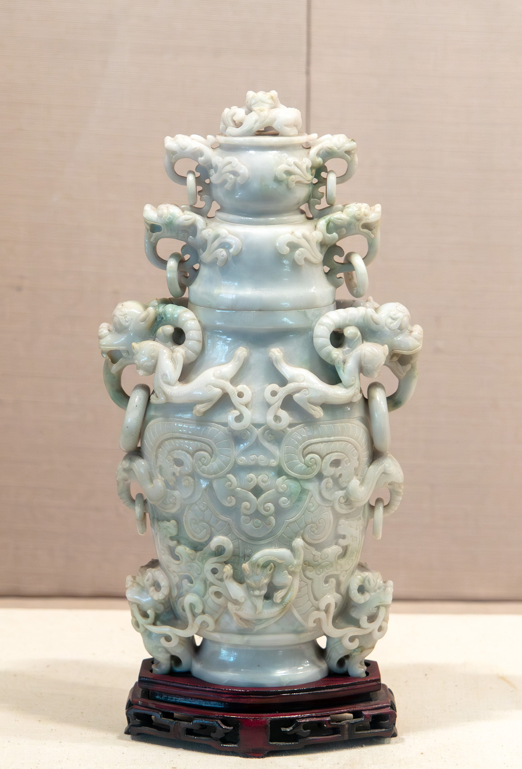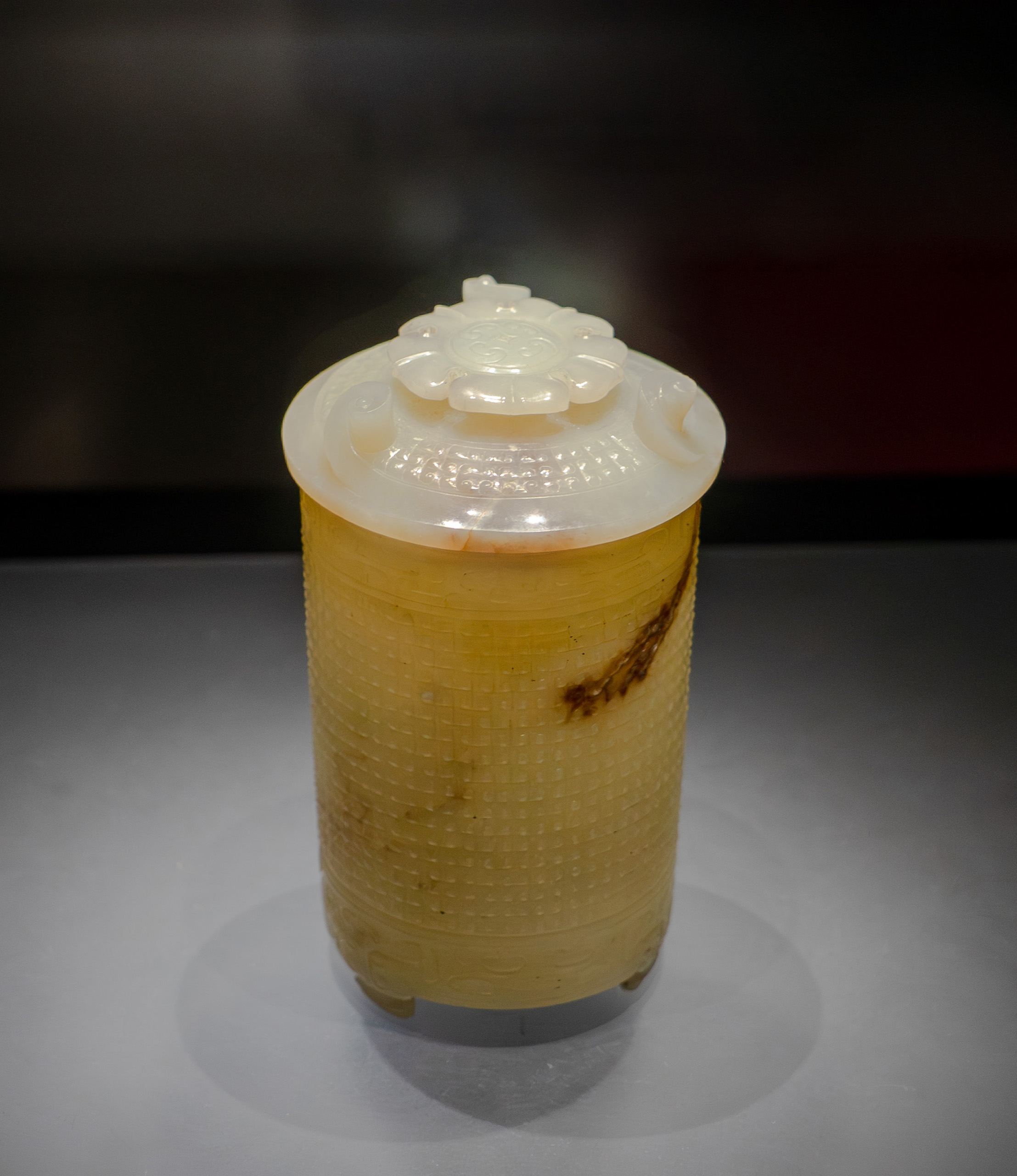 徐州博物馆玉卮,也就是酒杯。以整玉制作,由器盖和器身两部分组成。器身呈筒形,口略大,下支三兽形足。口沿及底边各有一卷云纹饰带,其间满饰勾连雷纹。器盖和器身以子母口相扣合,盖钮为五瓣柿蒂形,上饰四角星并填网纹。盖面四周凸雕三枚柱状钮。徐州博物馆镇馆之宝。