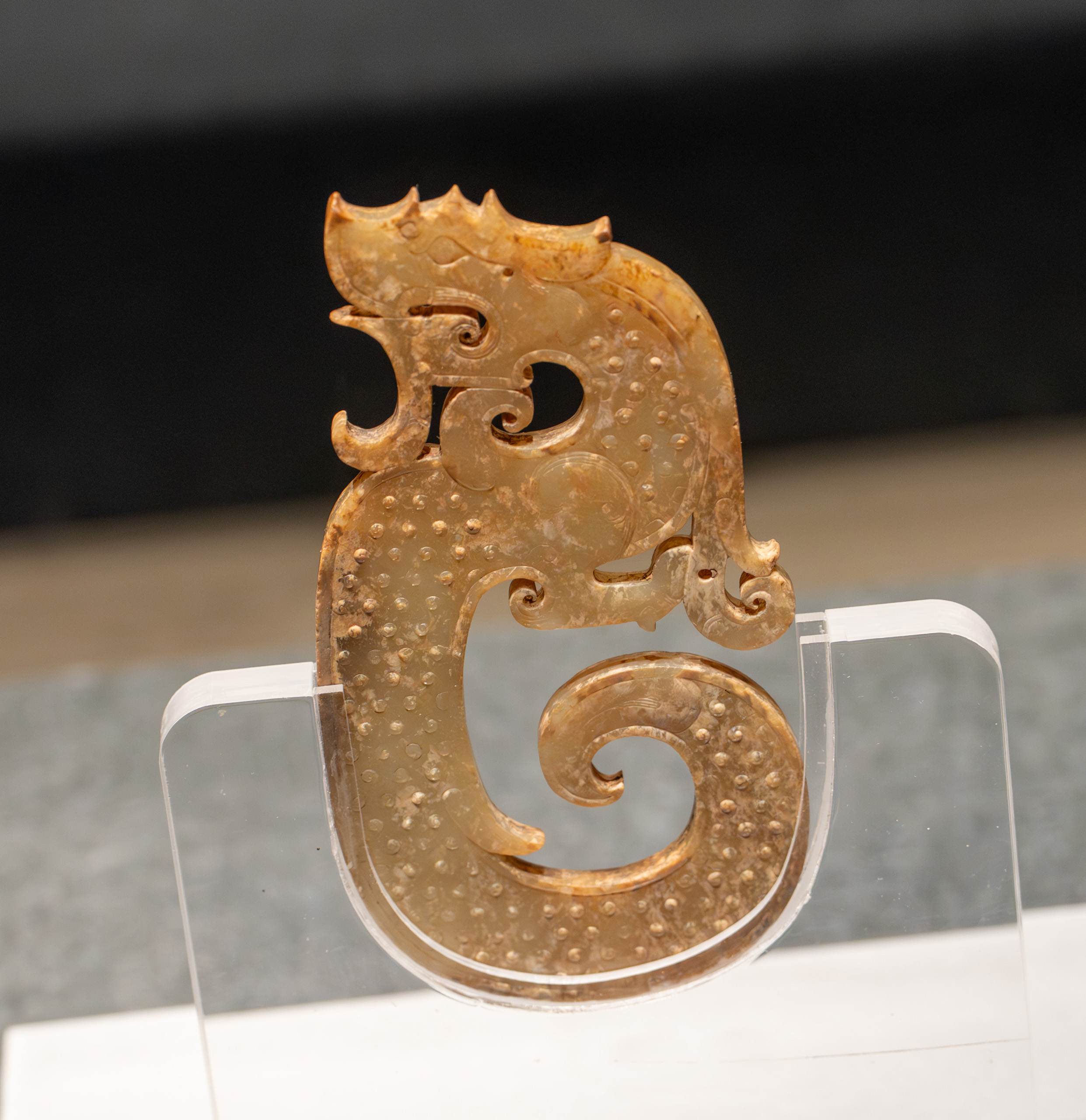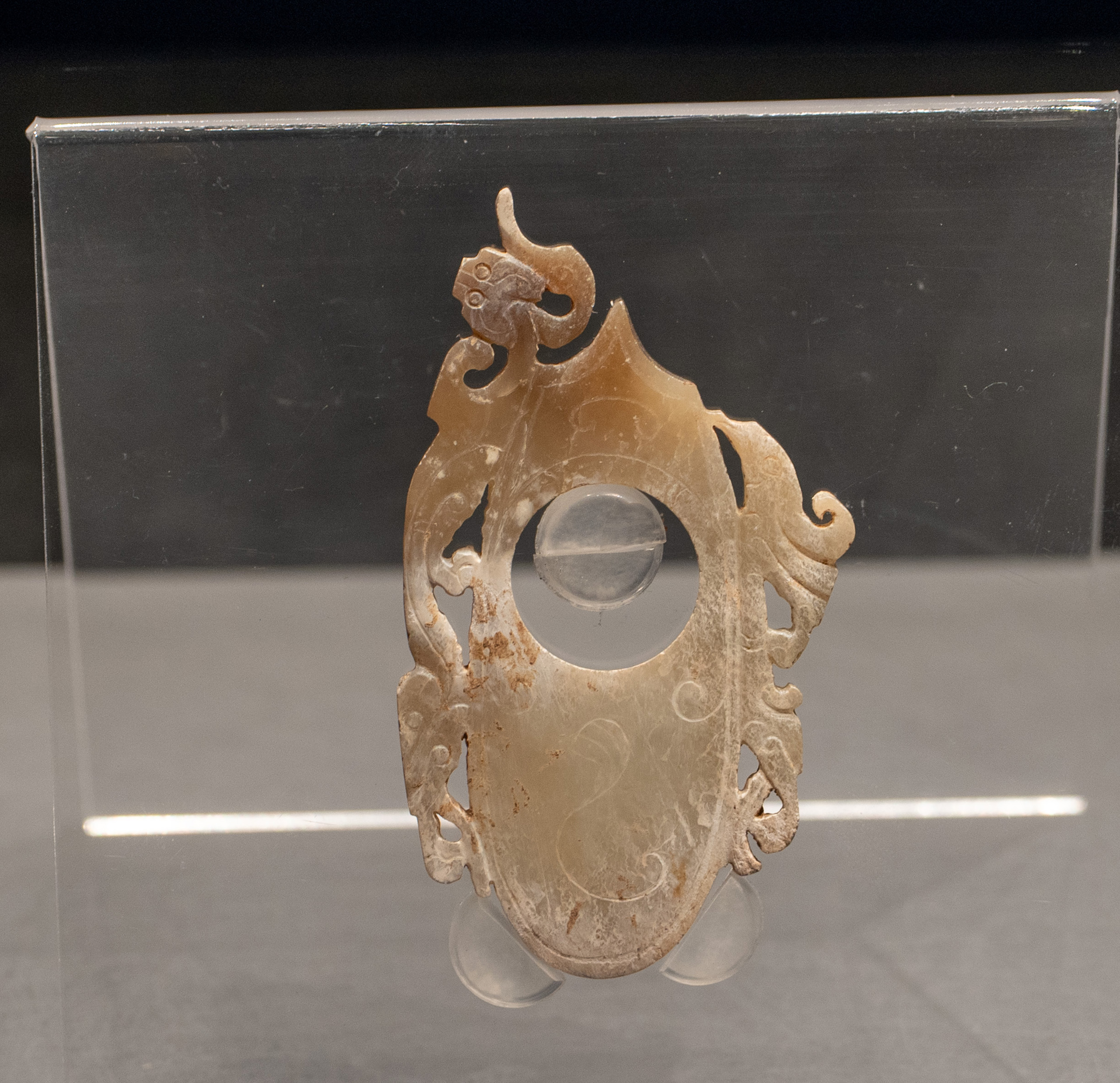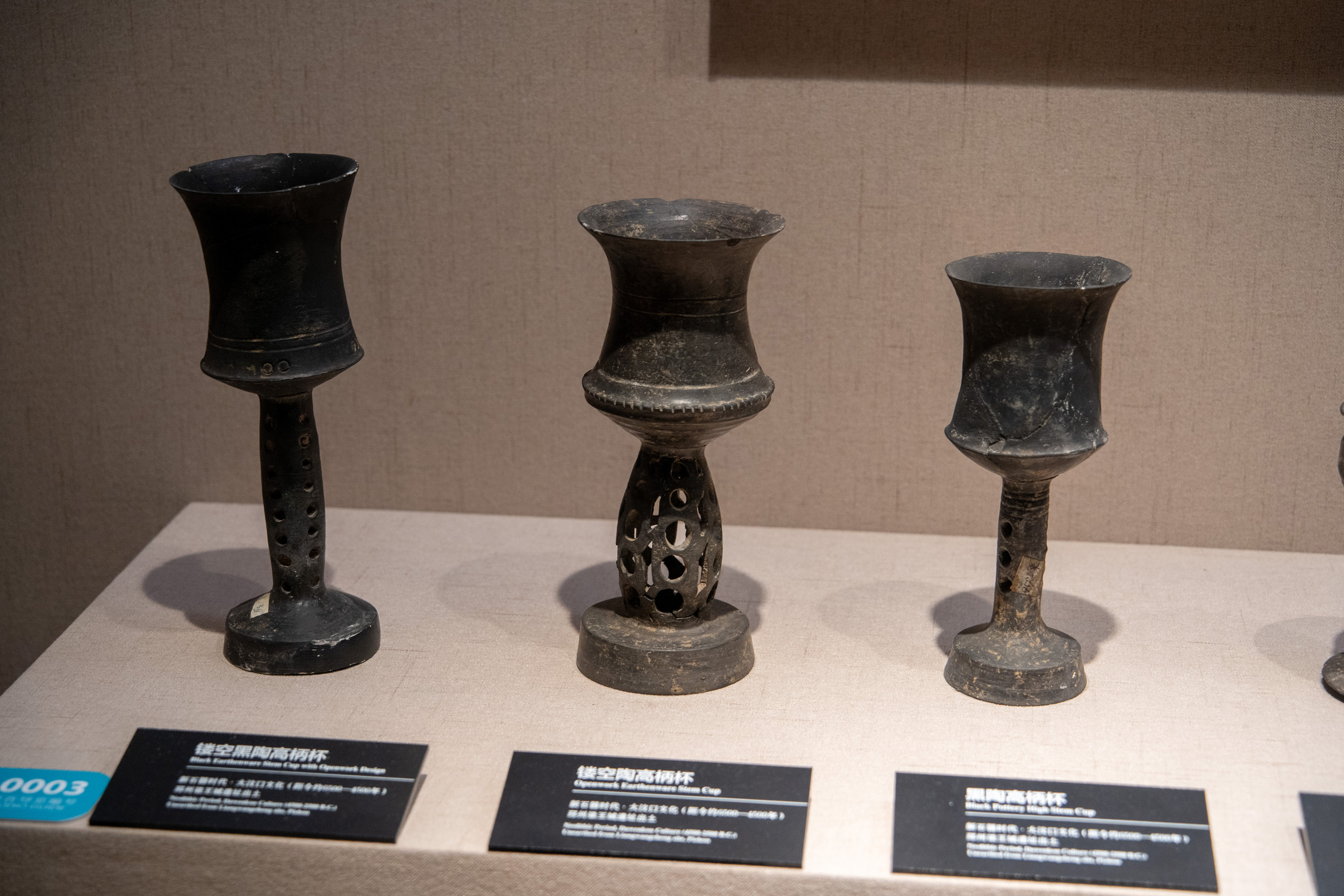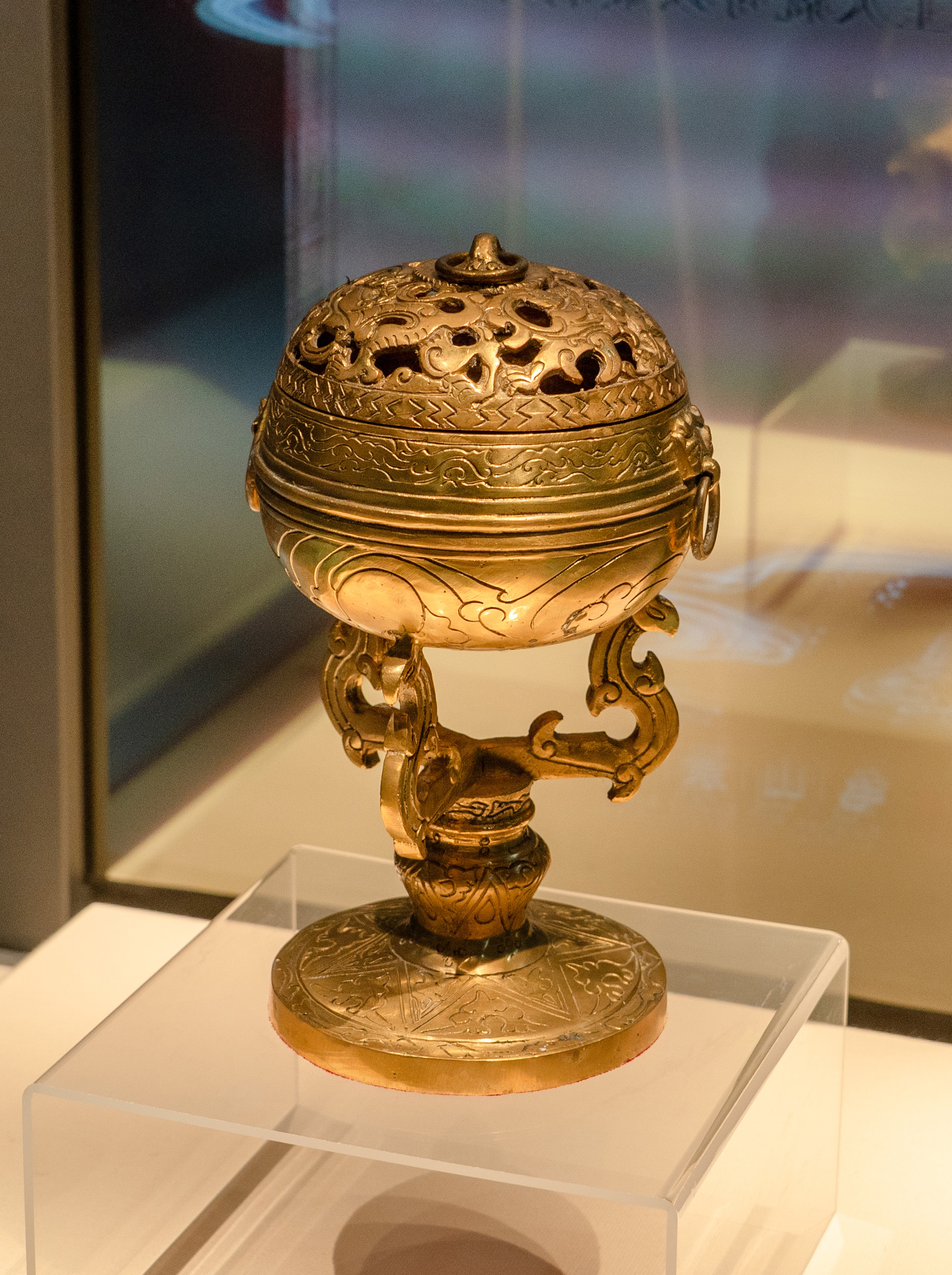 徐州博物馆玉卮,也就是酒杯。以整玉制作,由器盖和器身两部分组成。器身呈筒形,口略大,下支三兽形足。口沿及底边各有一卷云纹饰带,其间满饰勾连雷纹。器盖和器身以子母口相扣合,盖钮为五瓣柿蒂形,上饰四角星并填网纹。盖面四周凸雕三枚柱状钮。徐州博物馆镇馆之宝。