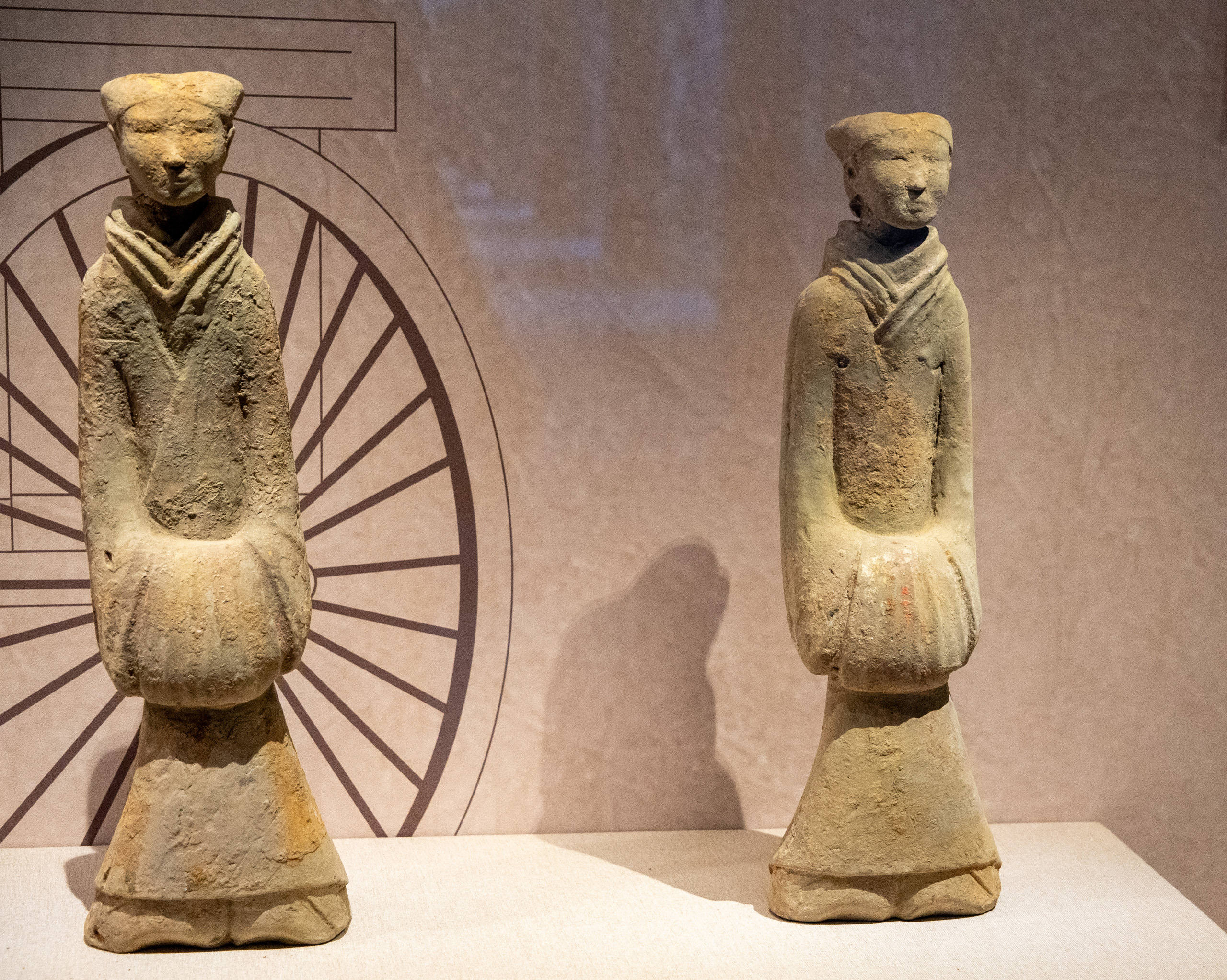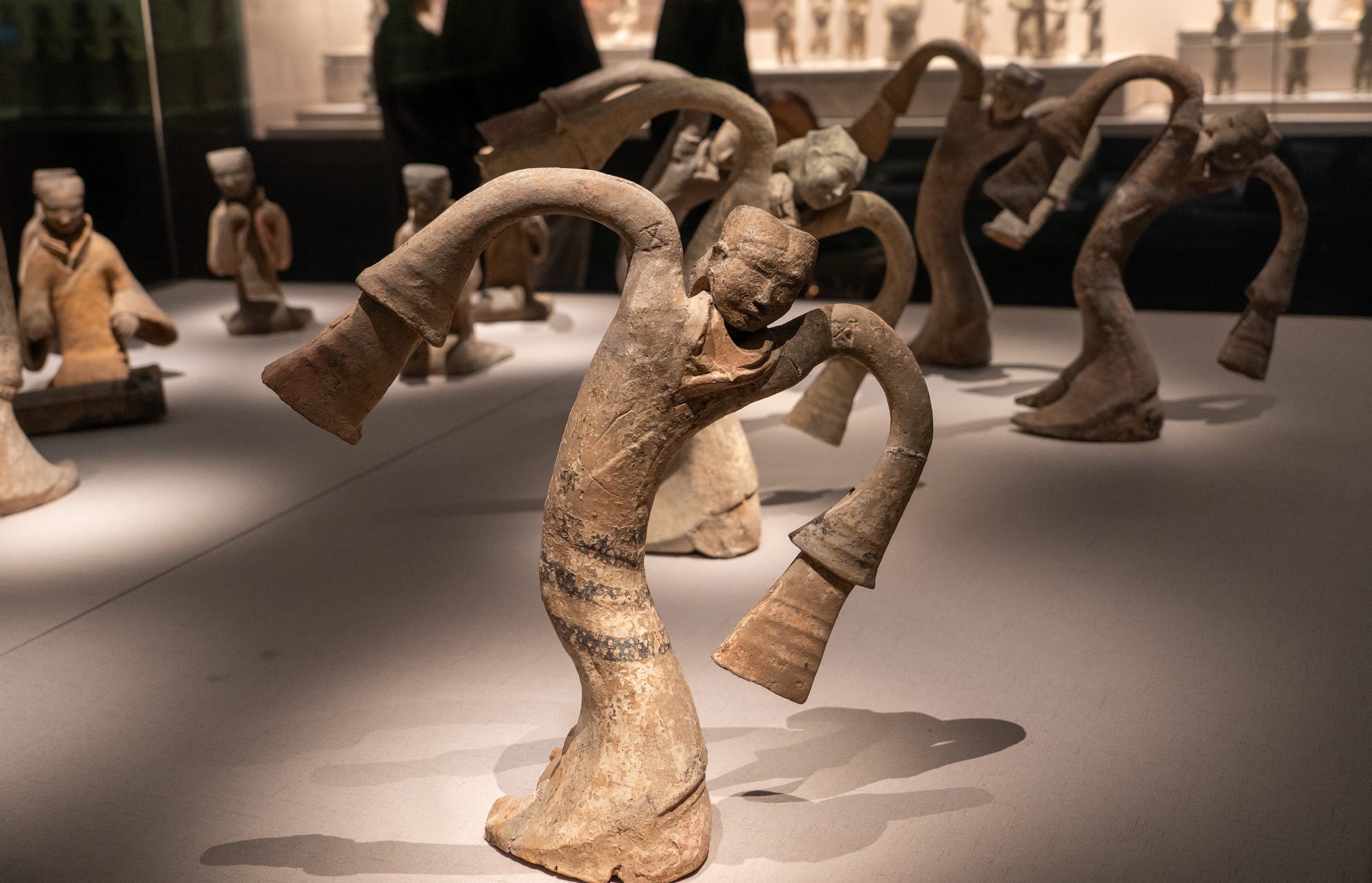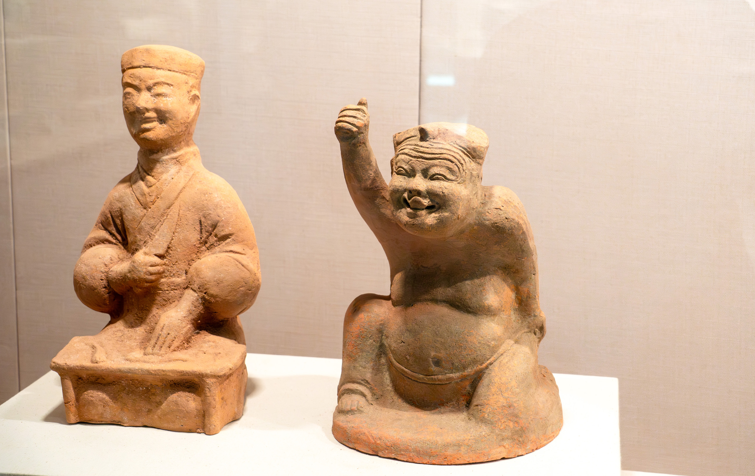 跳舞的陶俑。陶舞俑身着绕襟深衣,顶发中分,于脑后挽成发髻,眉目清秀,身姿娇柔,身体随着舞步的变化呈现出“S”形。双臂上举,左、右上臂前后各刻有一“五”字,长长的衣袖从空中向身后飘下,动感十足。这类舞俑的身体弯曲度和侧转度各不相同,舞姿亦有变化。从舞俑造型看,跳的应是当时盛行的长袖折腰楚舞。北洞山楚王墓出土有20件类似的舞俑,手臂弯肘处也刻有“五”字,笔划内填红彩。舞俑的手臂呈曲尺形,为单独烧制。这样的绕襟衣陶舞俑在其他地区未见出土,是了解西汉早期舞蹈造型的重要实物资料,弥足珍贵。