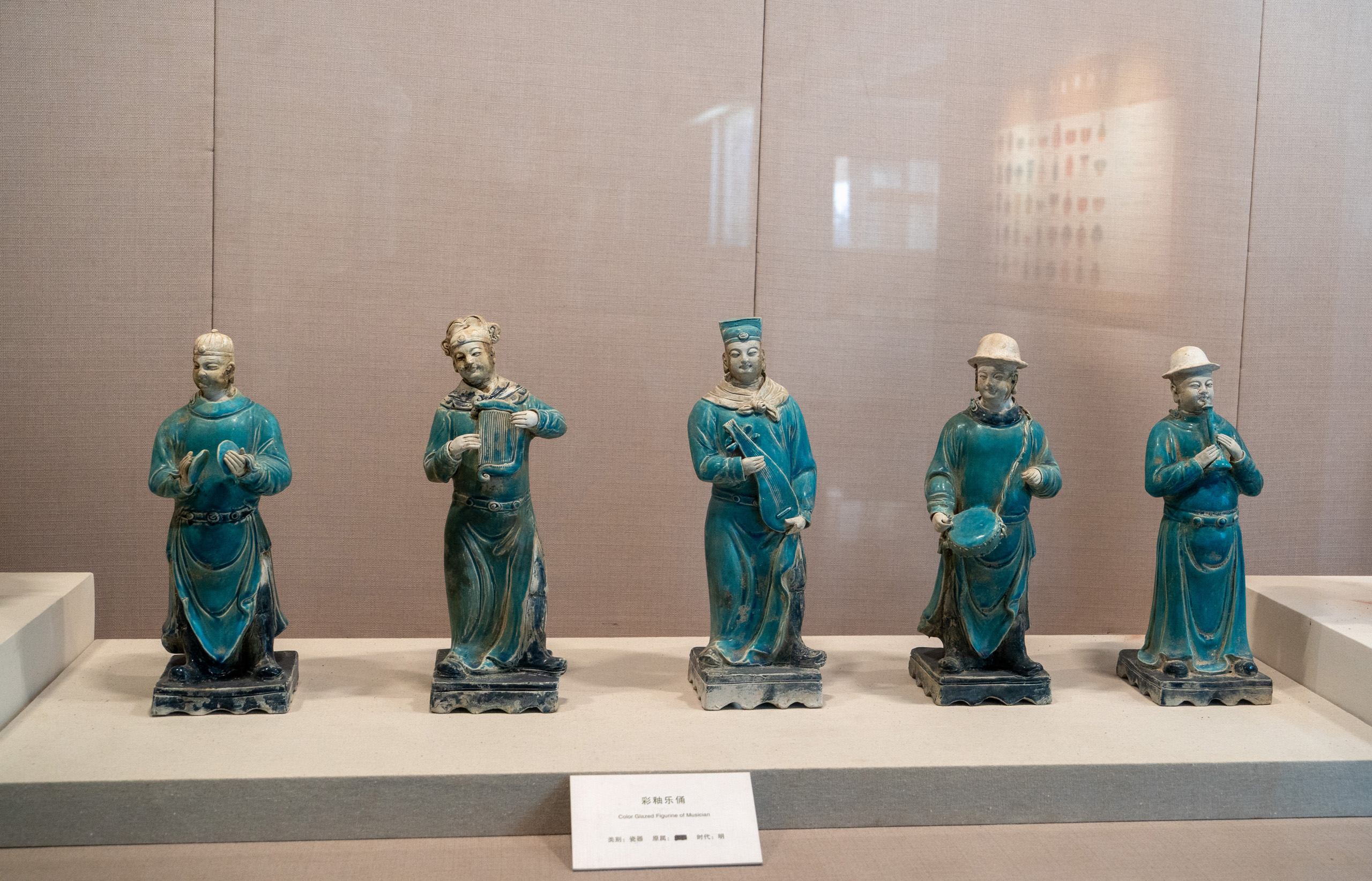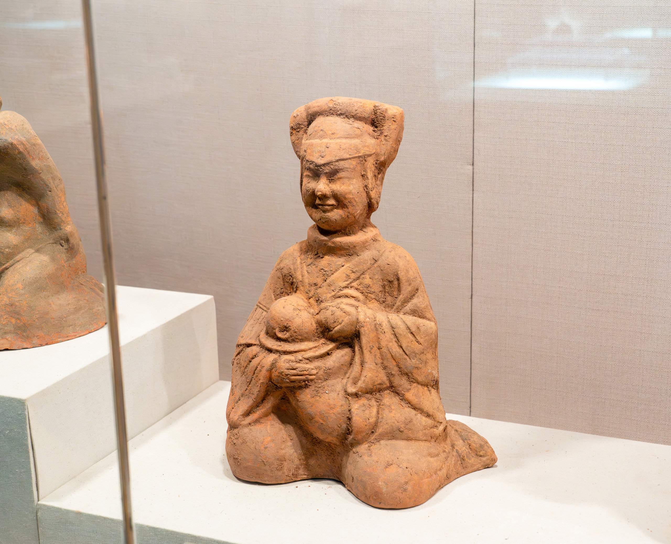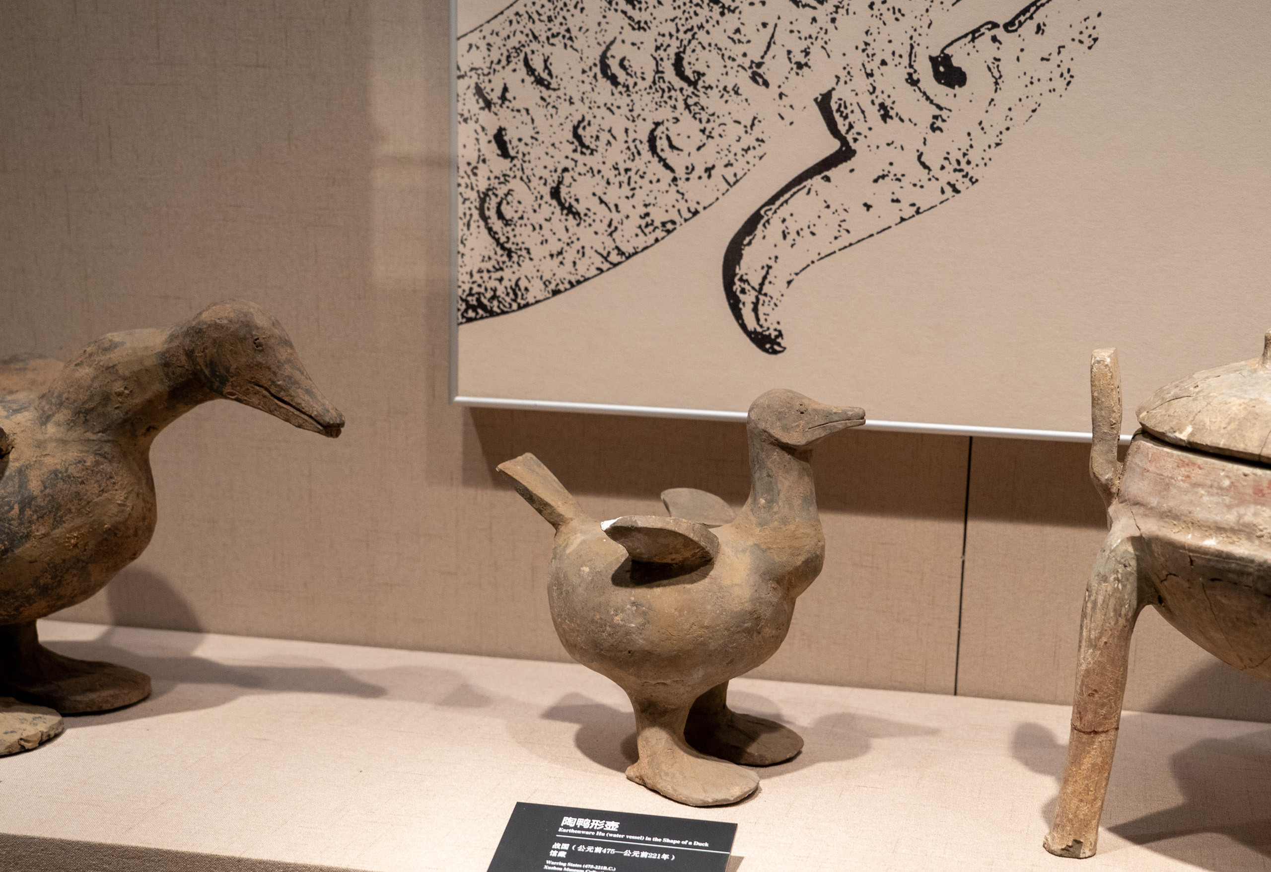 跳舞的陶俑。陶舞俑身着绕襟深衣,顶发中分,于脑后挽成发髻,眉目清秀,身姿娇柔,身体随着舞步的变化呈现出“S”形。双臂上举,左、右上臂前后各刻有一“五”字,长长的衣袖从空中向身后飘下,动感十足。这类舞俑的身体弯曲度和侧转度各不相同,舞姿亦有变化。从舞俑造型看,跳的应是当时盛行的长袖折腰楚舞。北洞山楚王墓出土有20件类似的舞俑,手臂弯肘处也刻有“五”字,笔划内填红彩。舞俑的手臂呈曲尺形,为单独烧制。这样的绕襟衣陶舞俑在其他地区未见出土,是了解西汉早期舞蹈造型的重要实物资料,弥足珍贵。