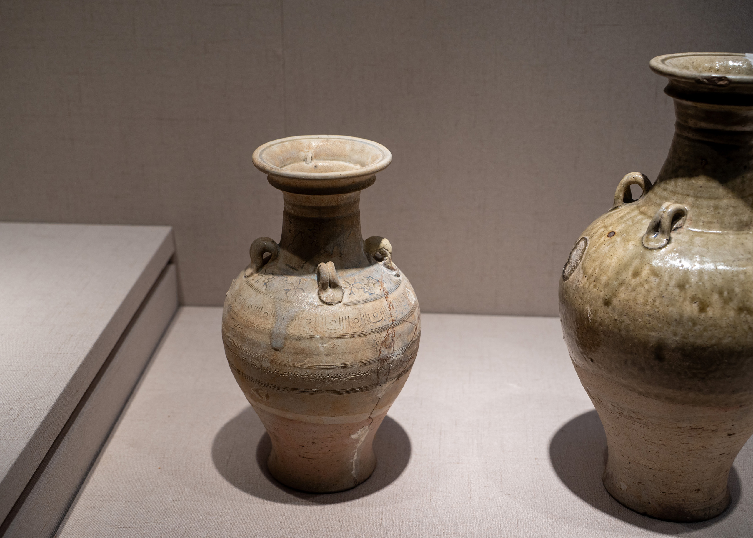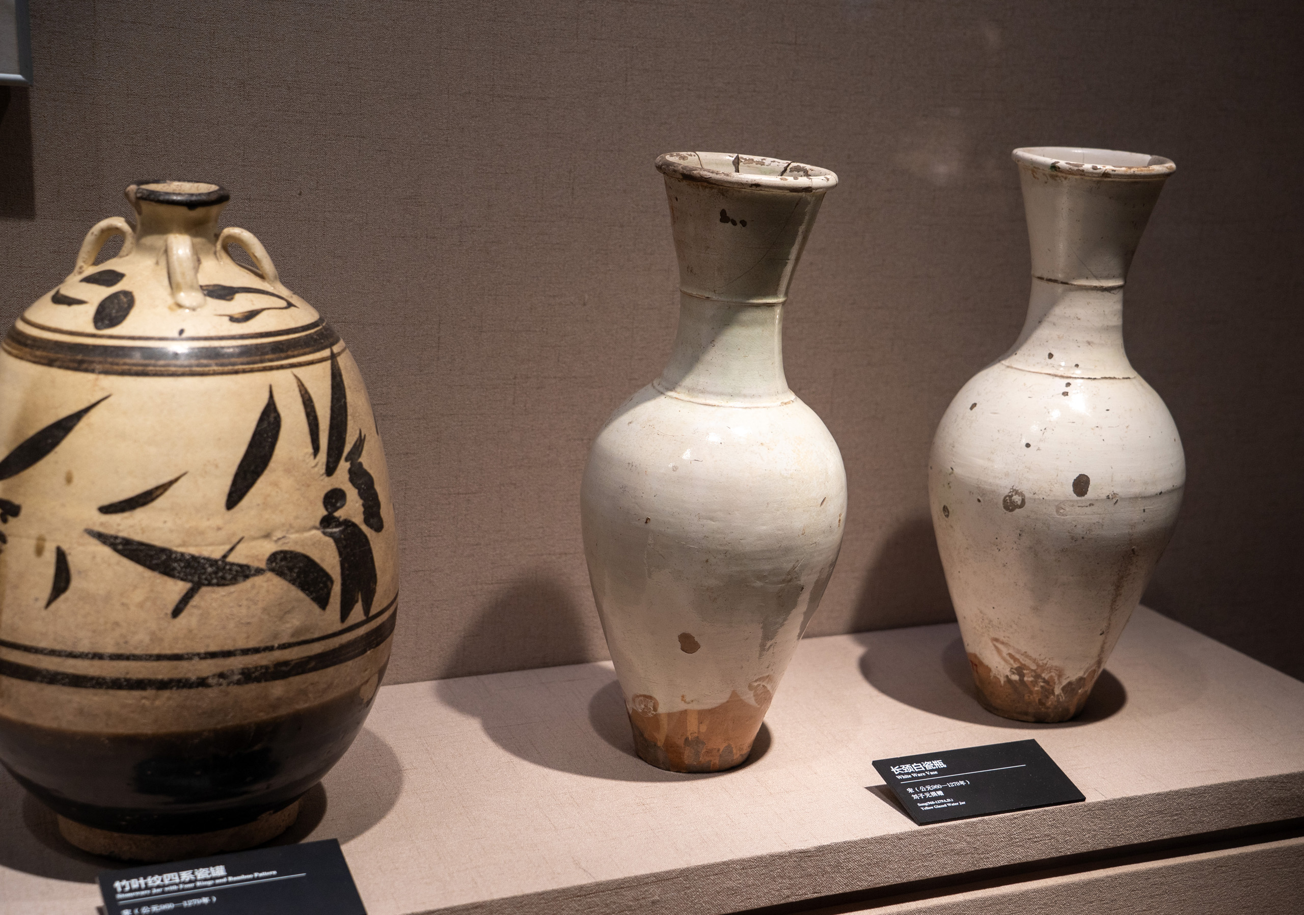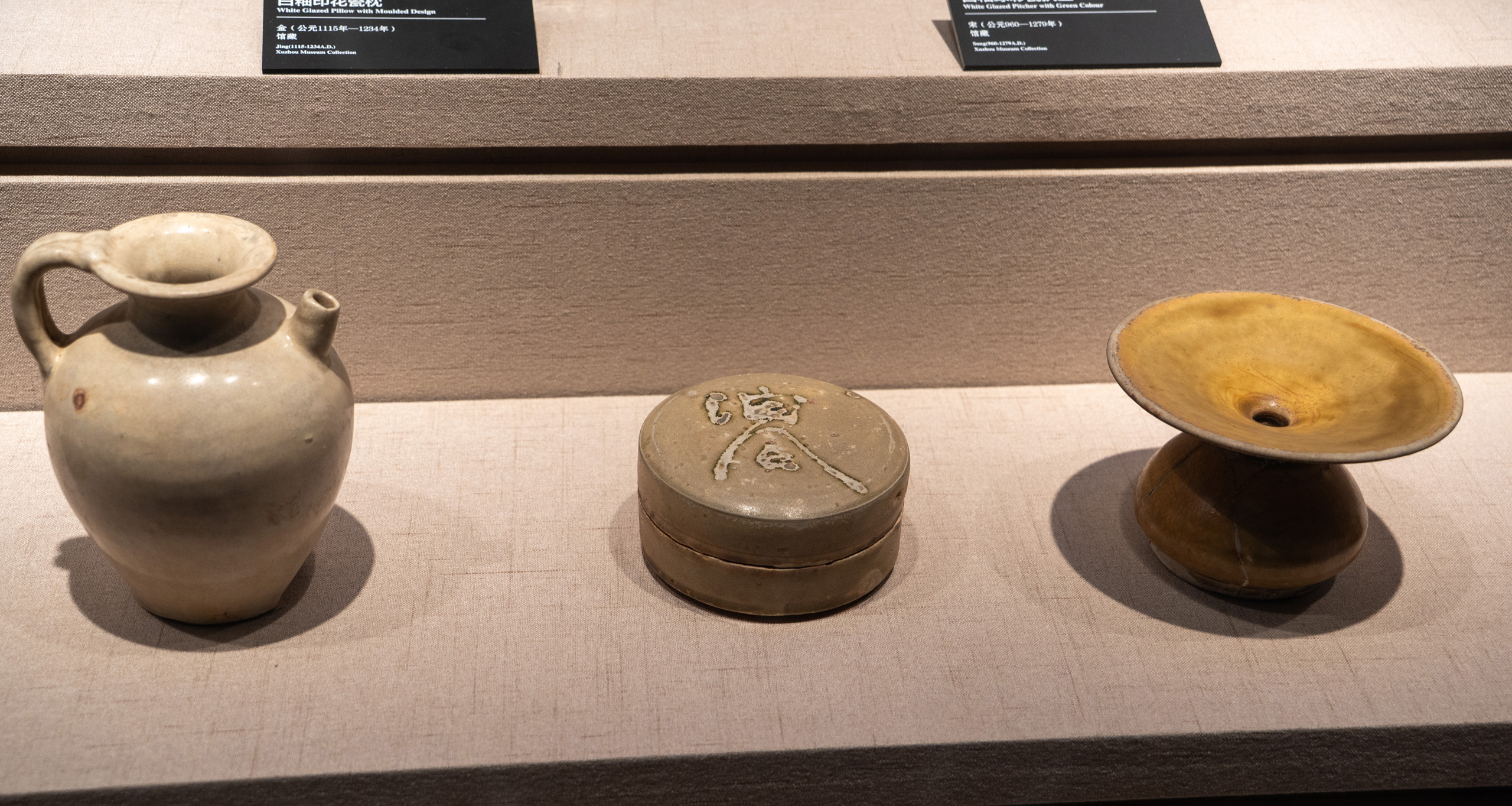 徐州博物馆,瓷器。中间盒上的字是油合,古代带盖的盒也写作合,盛放化妆品的,化妆盒。这三个是一套,执壶,是用来洗手的,渣斗,是卸妆用的,油盒(合),化妆品盒用来化妆。