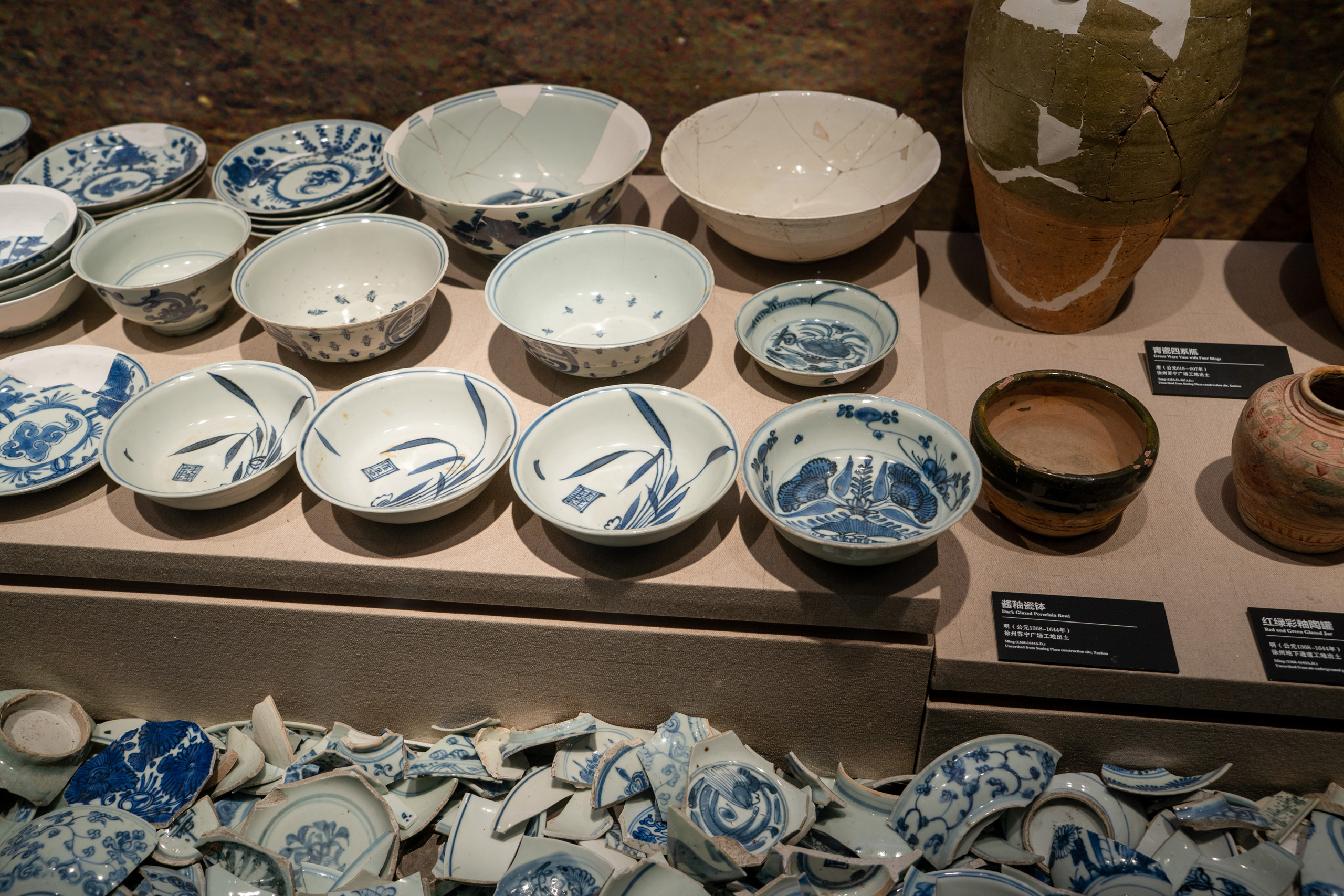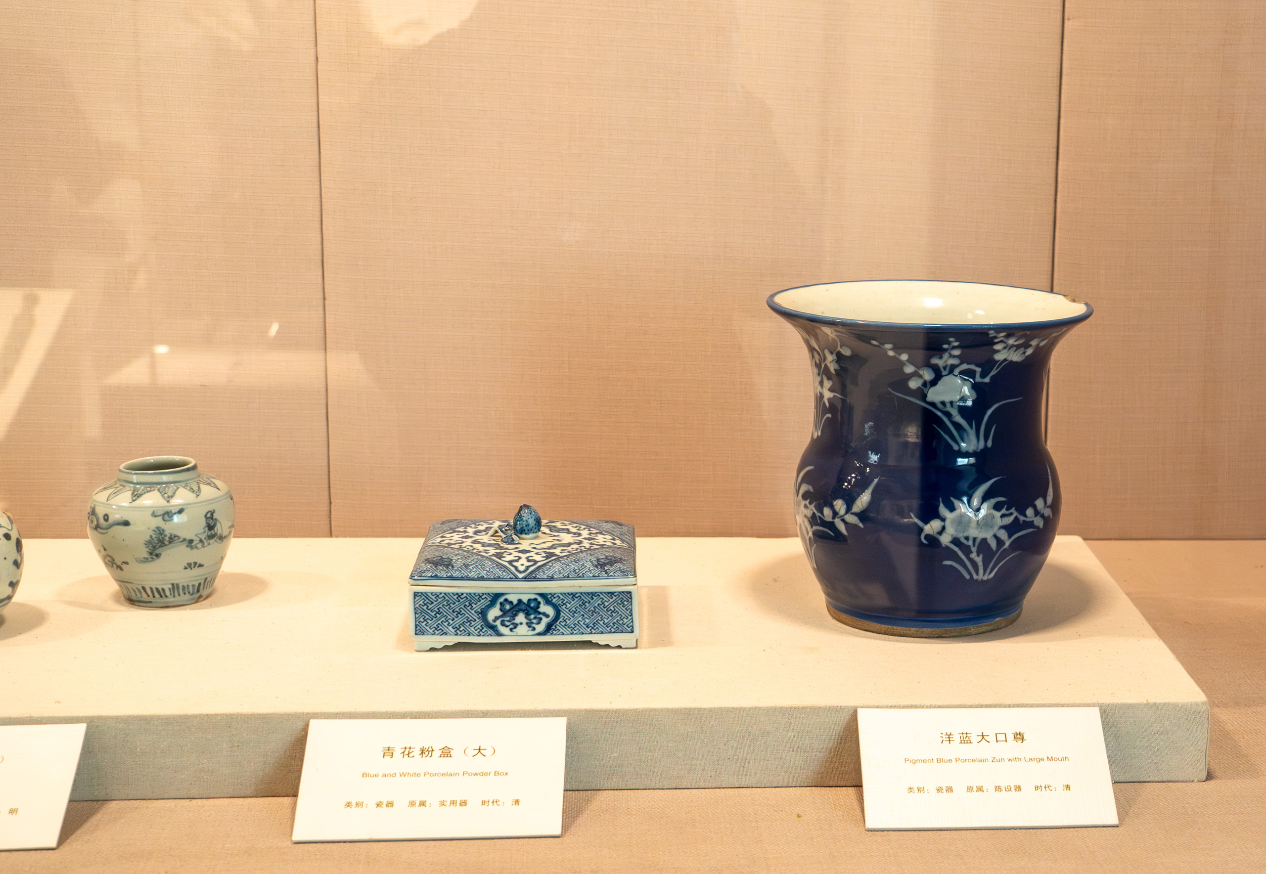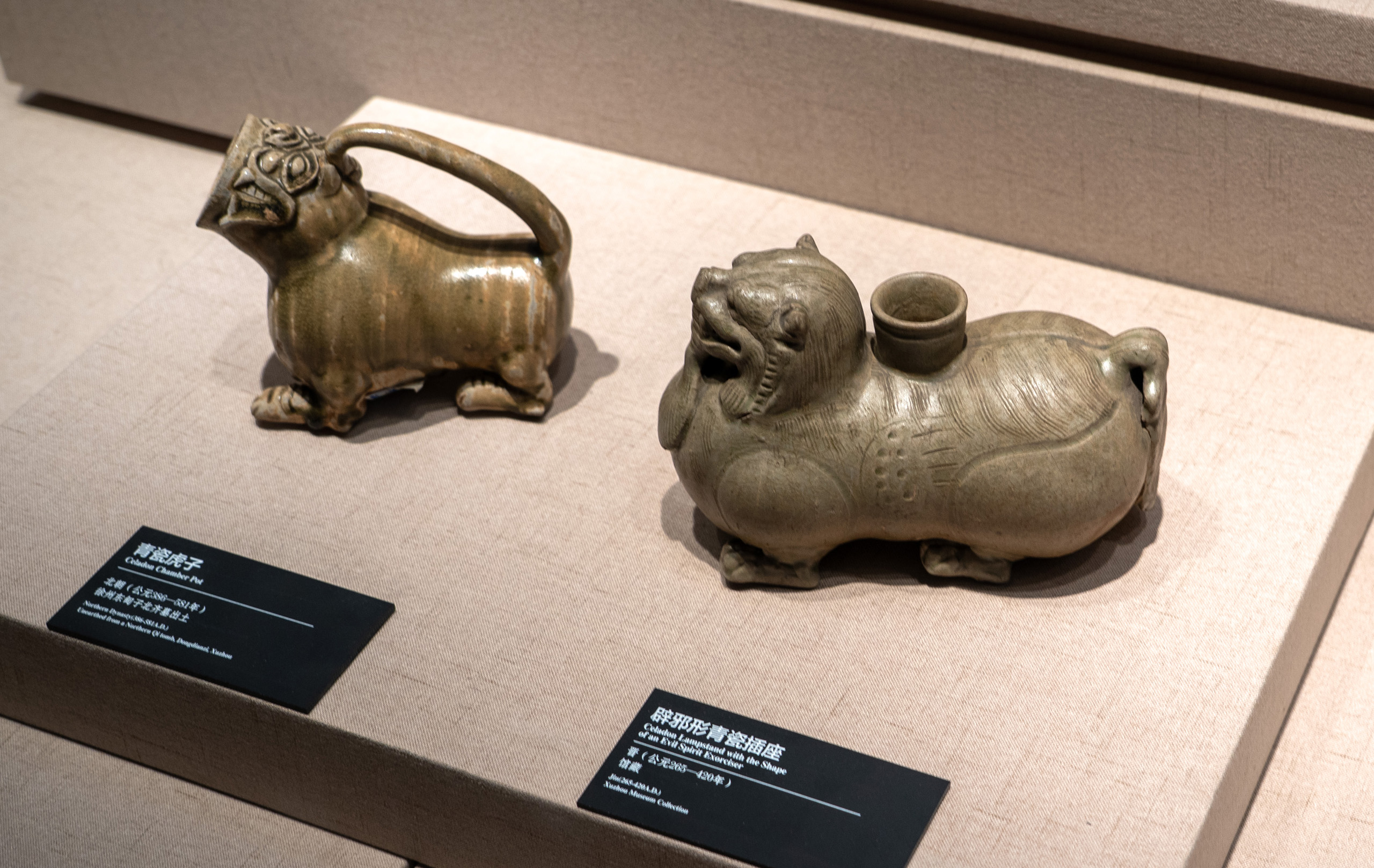 徐州博物馆,瓷器。中间盒上的字是油合,古代带盖的盒也写作合,盛放化妆品的,化妆盒。这三个是一套,执壶,是用来洗手的,渣斗,是卸妆用的,油盒(合),化妆品盒用来化妆。