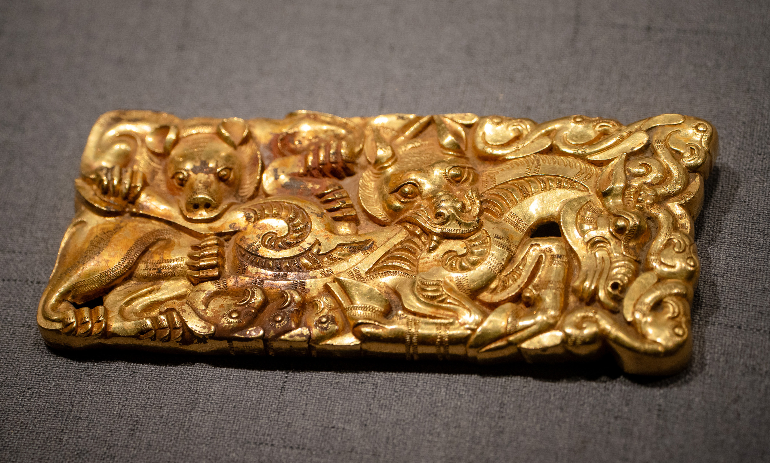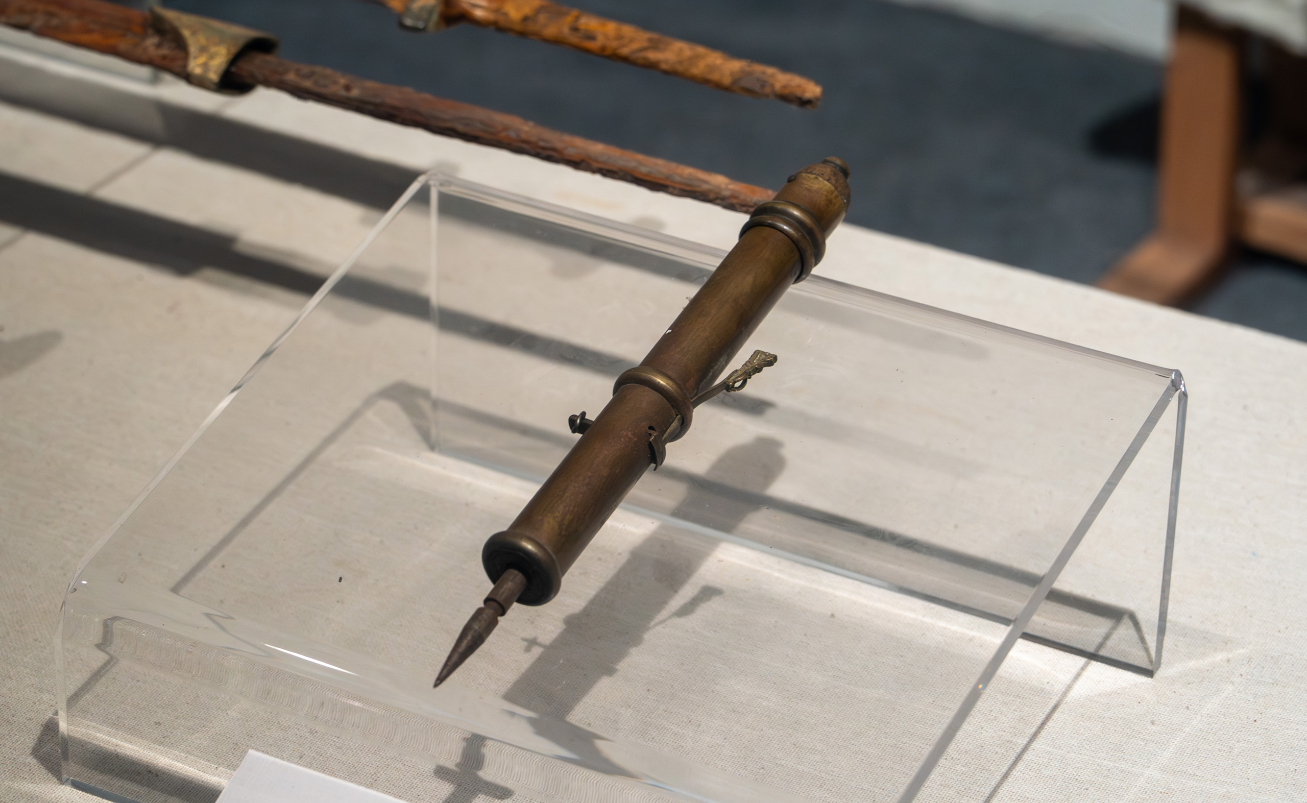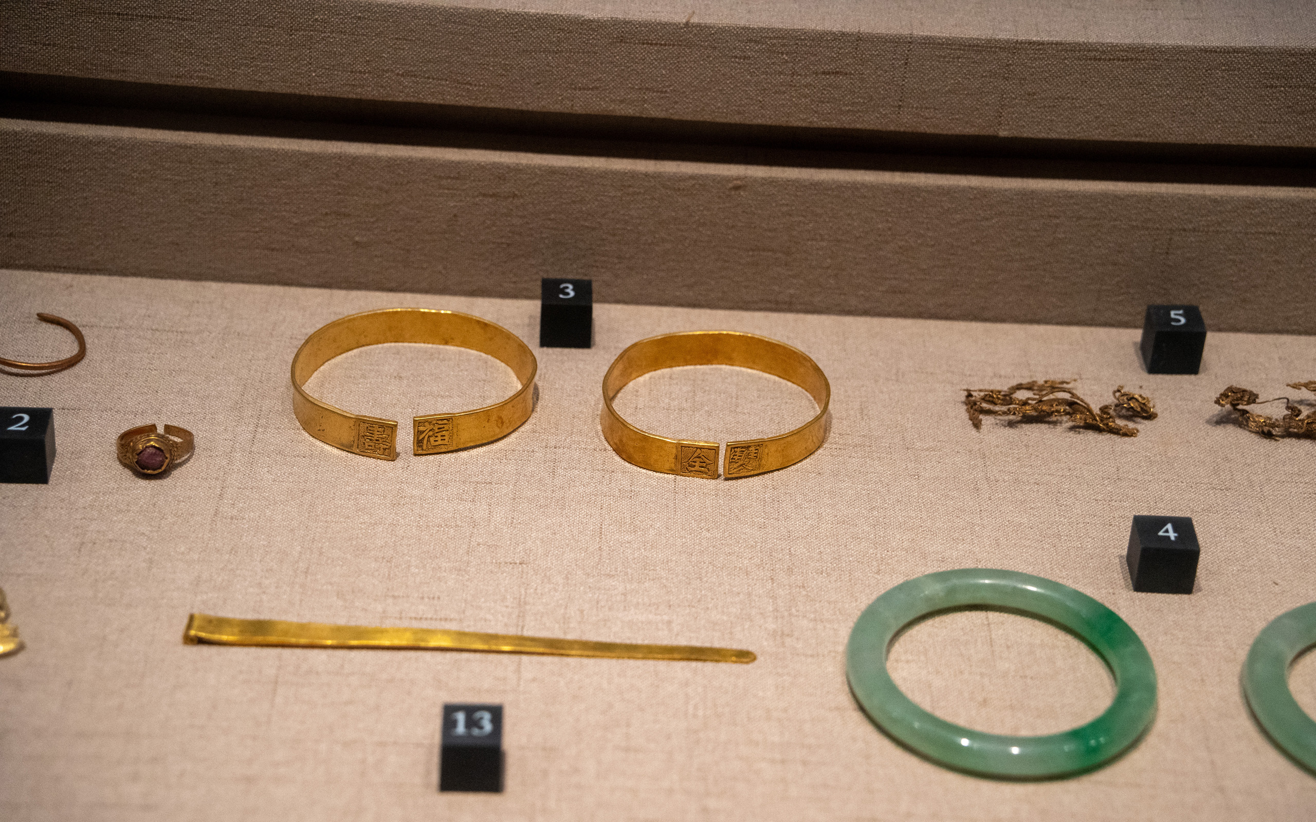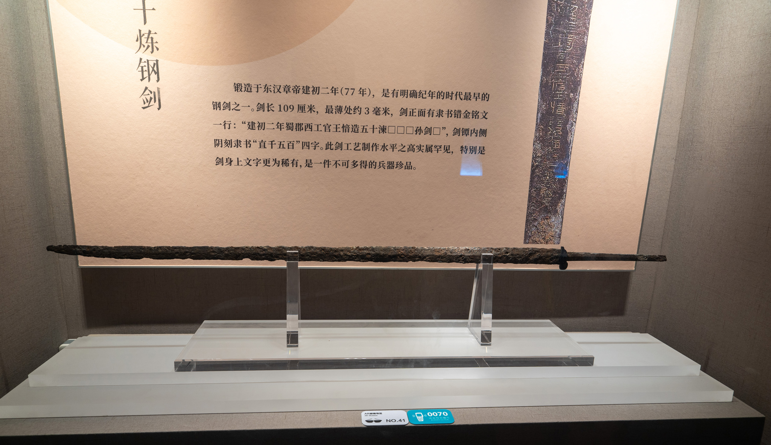 徐州博物馆,五十炼钢剑,镇馆之宝。钢剑锋部稍残,无剑首,剑把长20.5、宽1.2-1.7、厚0.6-0.9厘米。把上有麻织物痕迹。剑原有鞘,为苎胎髹漆,已朽附剑上。剑把正面有隶书错金铭文一行“建初二年蜀郡西工官王愔造五十湅□□□孙剑□”。剑镡内侧阴刻隶书“直千五百”四字。