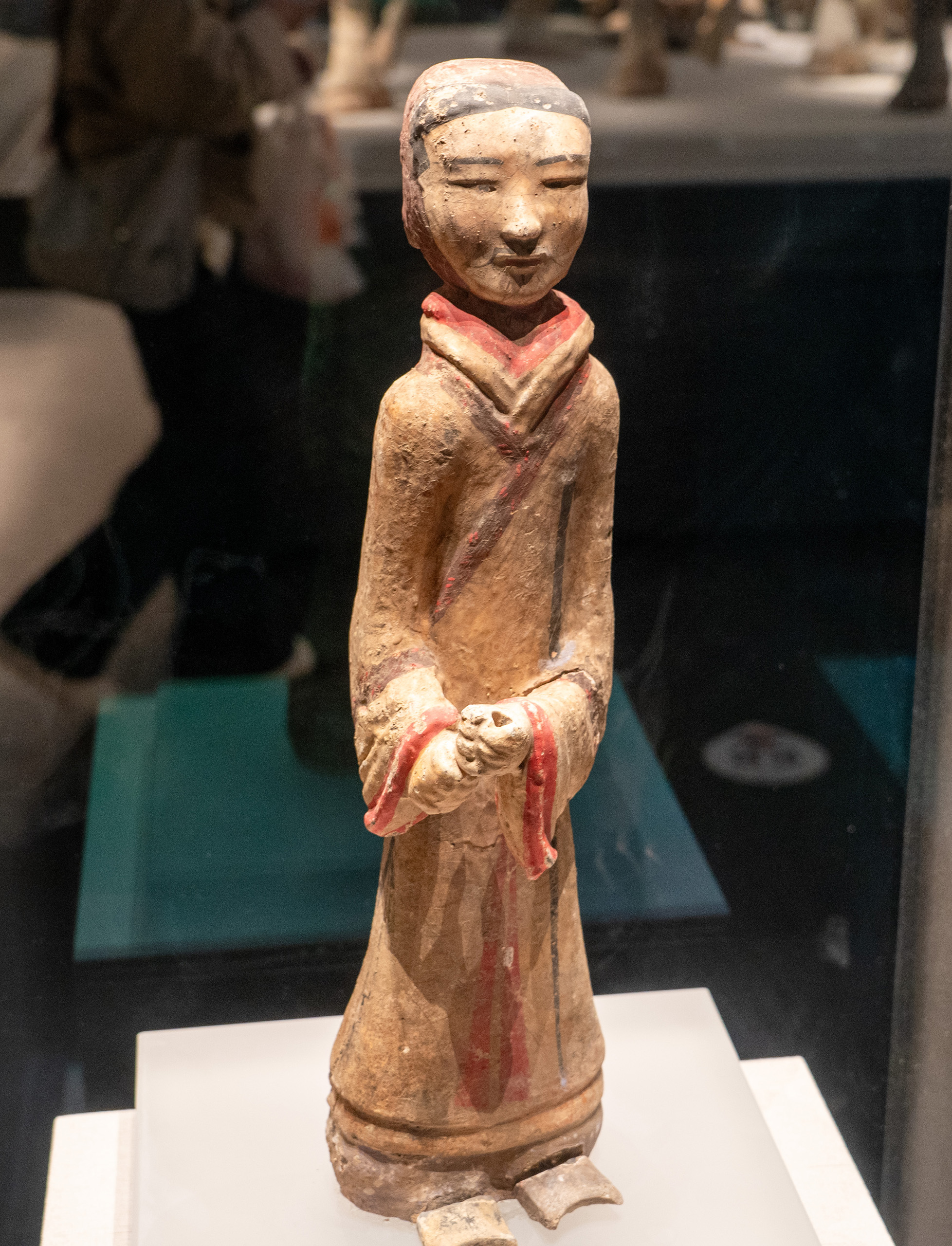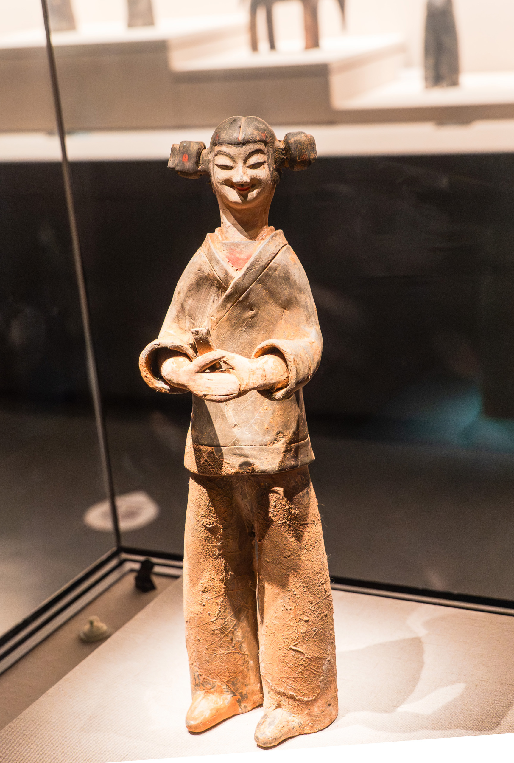 北朝彩绘陶女立俑,女俑双髻盘于两耳侧,发式别致。面部有红、黑两色靥,细眉上挑,高鼻直挺,朱唇含笑。上身着黑色短衣,下着肥管长裤,露履于外,双手相合拥笏于胸前。这种短衣长裤的服饰来源于中国北方的游牧民族。此俑为典型的北方胡人少女形象,天真烂漫,生动自然。